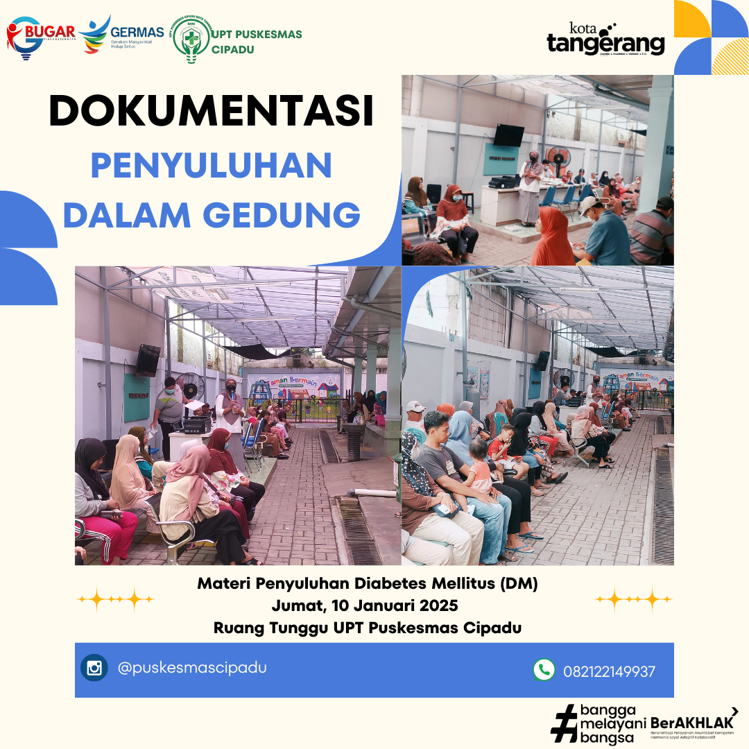 Pada Jumat pagi, 10 Januari 2025, penyuluhan kesehatan bertema "Diabetes Mellitus: Kenali, Cegah, dan Kendalikan". Kegiatan dilakukan pada pukul 07.40 WIB. Penyuluhan ini diikut oleh Pengunjung dan Pasien UPT Puskesmas Cipadu.