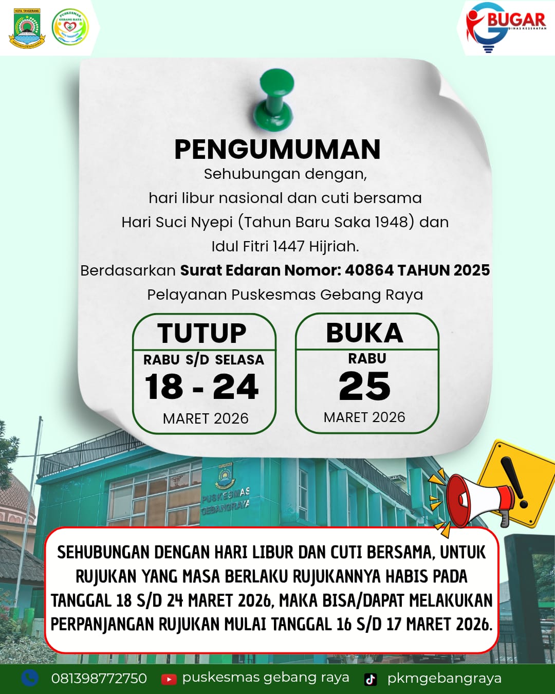 Memasuki bulan Maret yang bertepatan dengan bulan ramadhan 1446 H/ 2025, pelayanan puskesmas luar gedung di posyandu wilayah kelurahan gebang raya tetap berjalan seperti biasa, adaapun jadwal posyandu ILP tertera pada gambar.